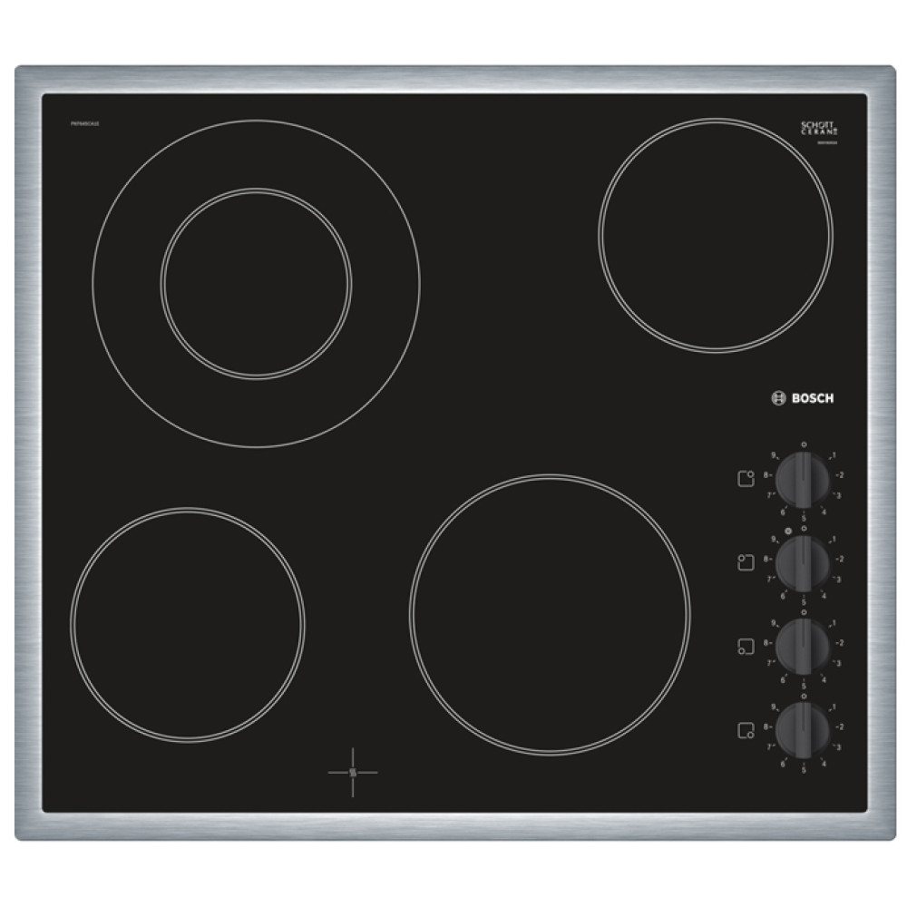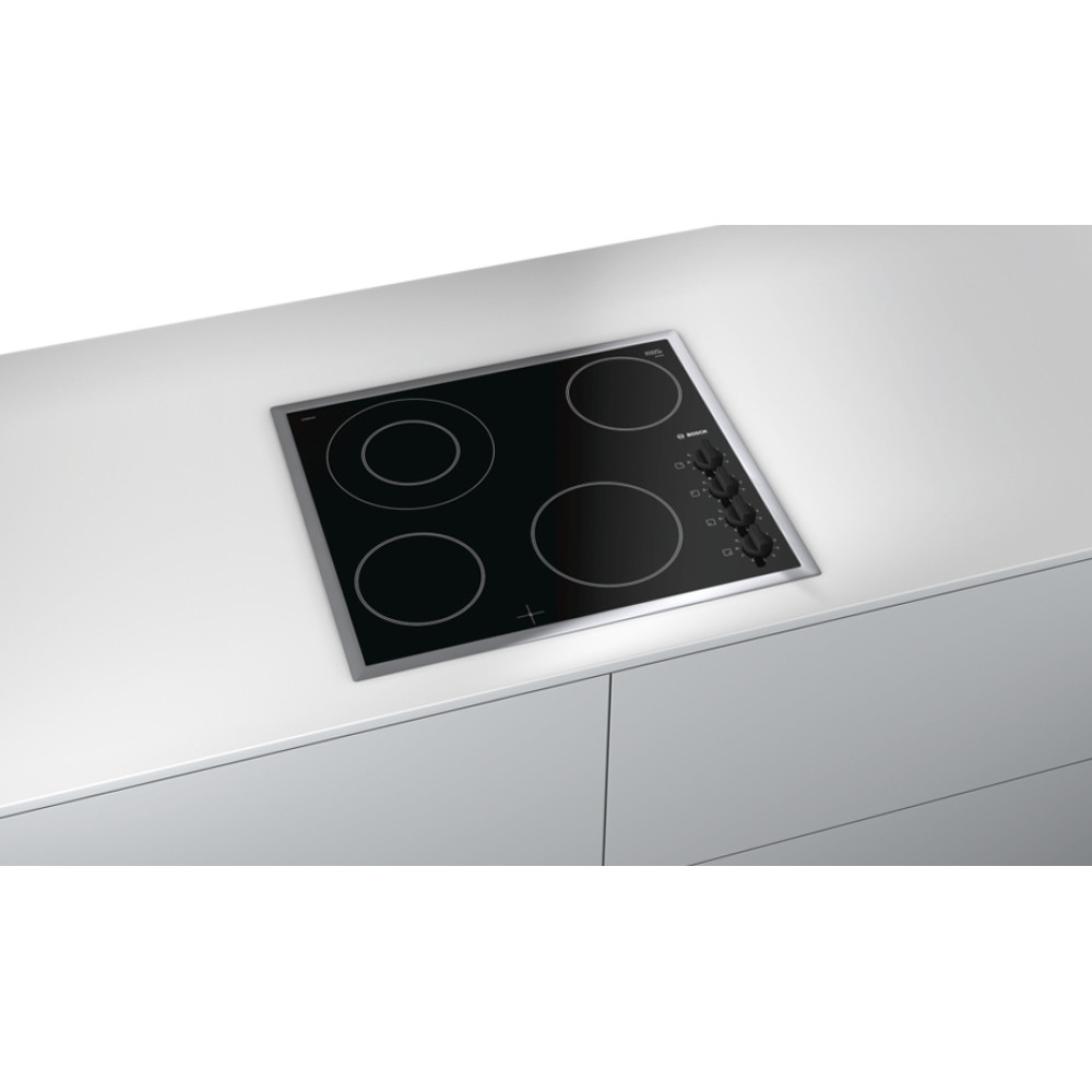 Електрична варильна поверхня Бош на 60 см з металевою рамкою по периметру. 4 конфорки надшвидкого нагрівання HighSpeed. 9 рівнів потужності. Основа варильної поверхні з високопровід ної склокераміки HighSpeed.