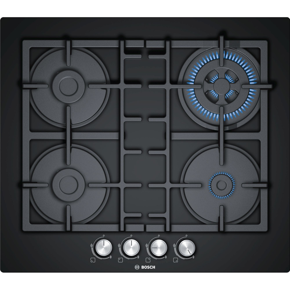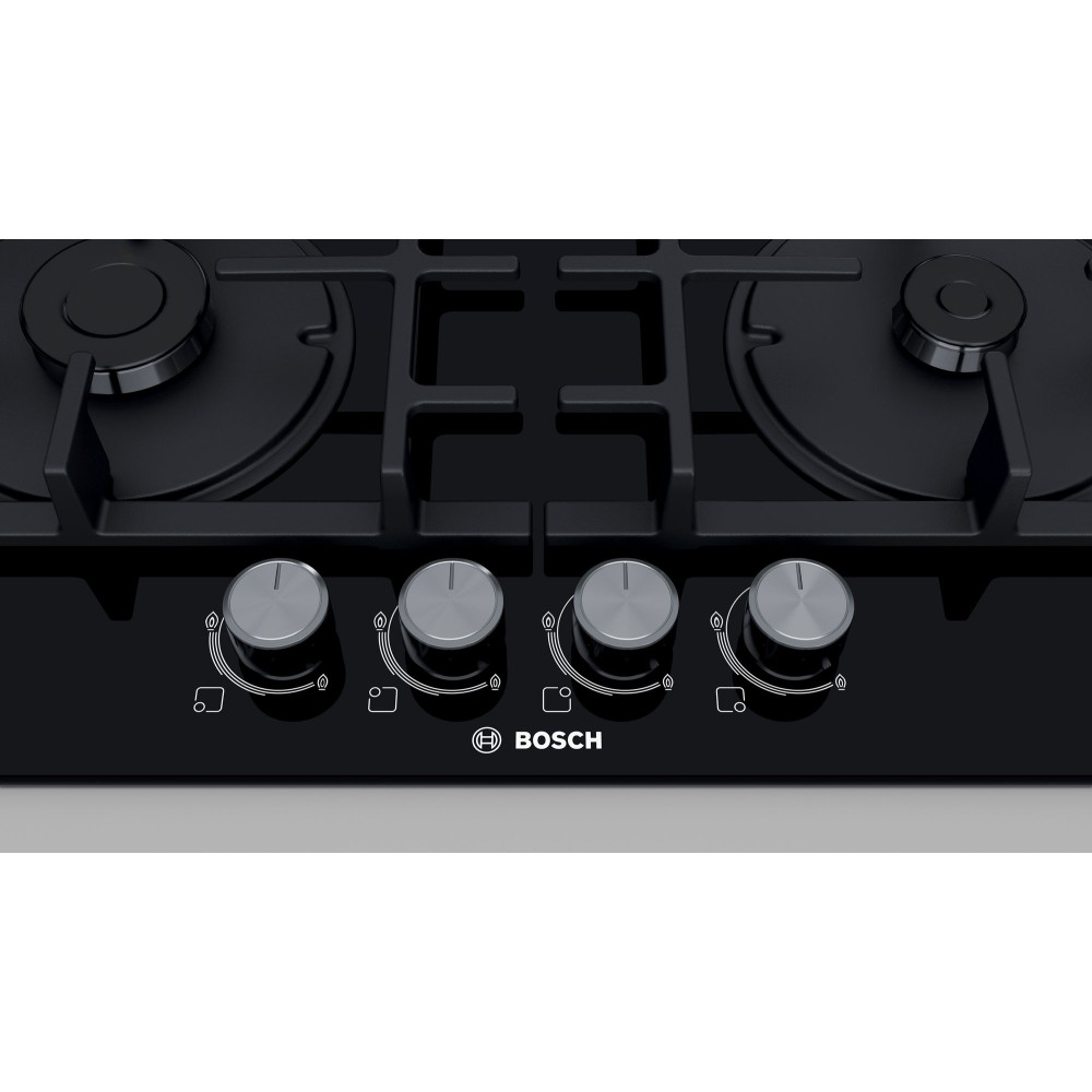 Газова поверхня Бош із загартованого скла чорного кольору на 60 см. Автоматичне електрозапалювання. Конфорка Wok. Матеріал решіток - чавун. Термоелектричний захист від витоку газу.