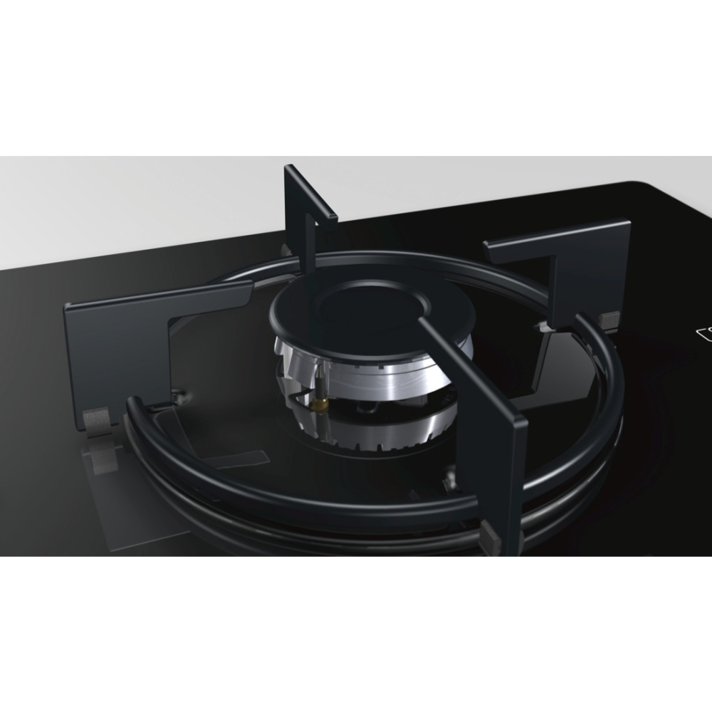 Газова поверхня з загартованого скла чорного кольору на 60 см. Автоматичне електрозапалювання. Окремі емальовані сталеві решітки для посуду. Термоелектричний захист від витікання газу.