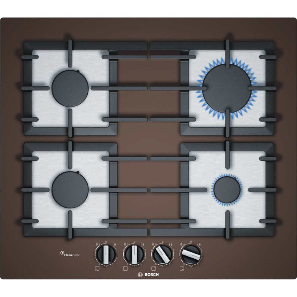 Варильна поверхня із загартованогое скла коричневого кольору на 60 см. Дизайн без рамки (вбудовування врівень). Технологія управління потужністю FlameSelect. Окремі чавунні решітки для посуду.