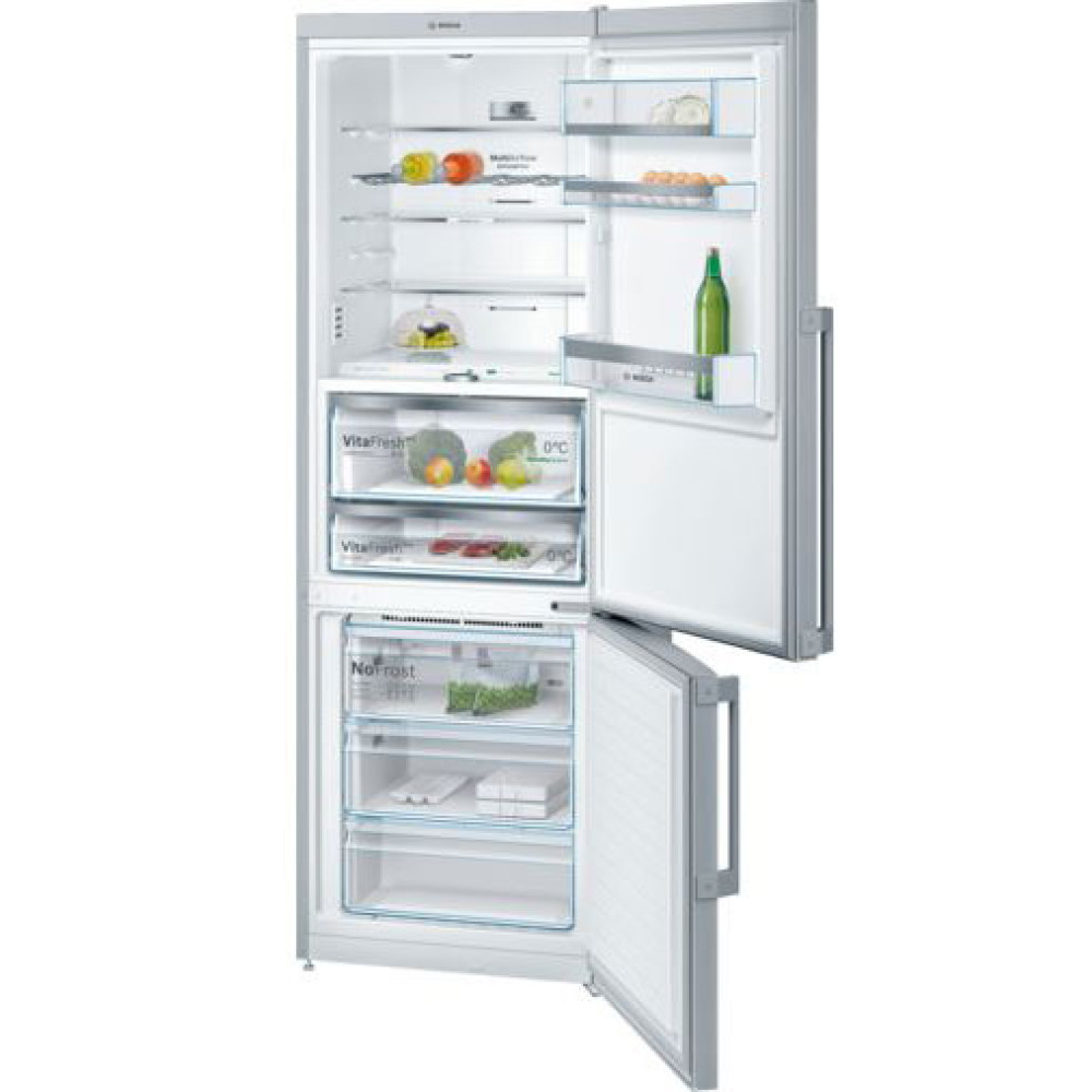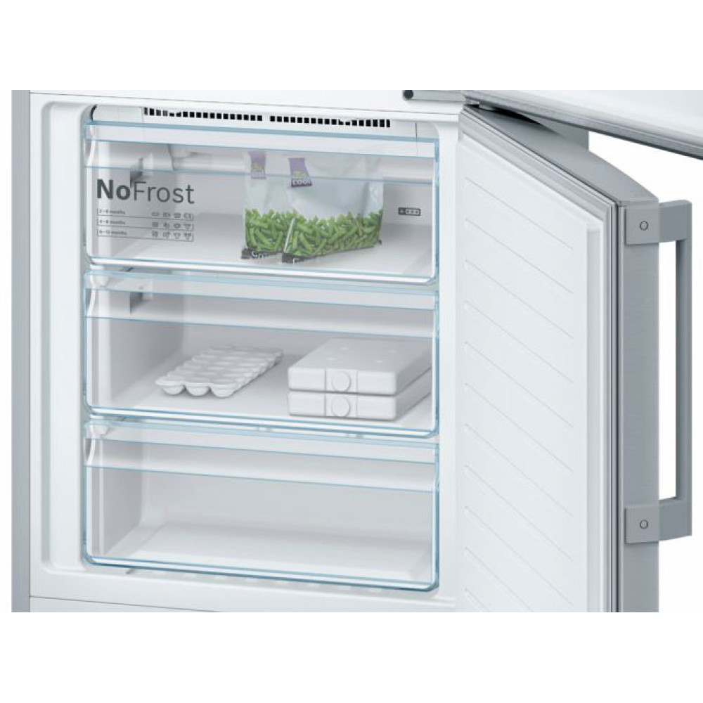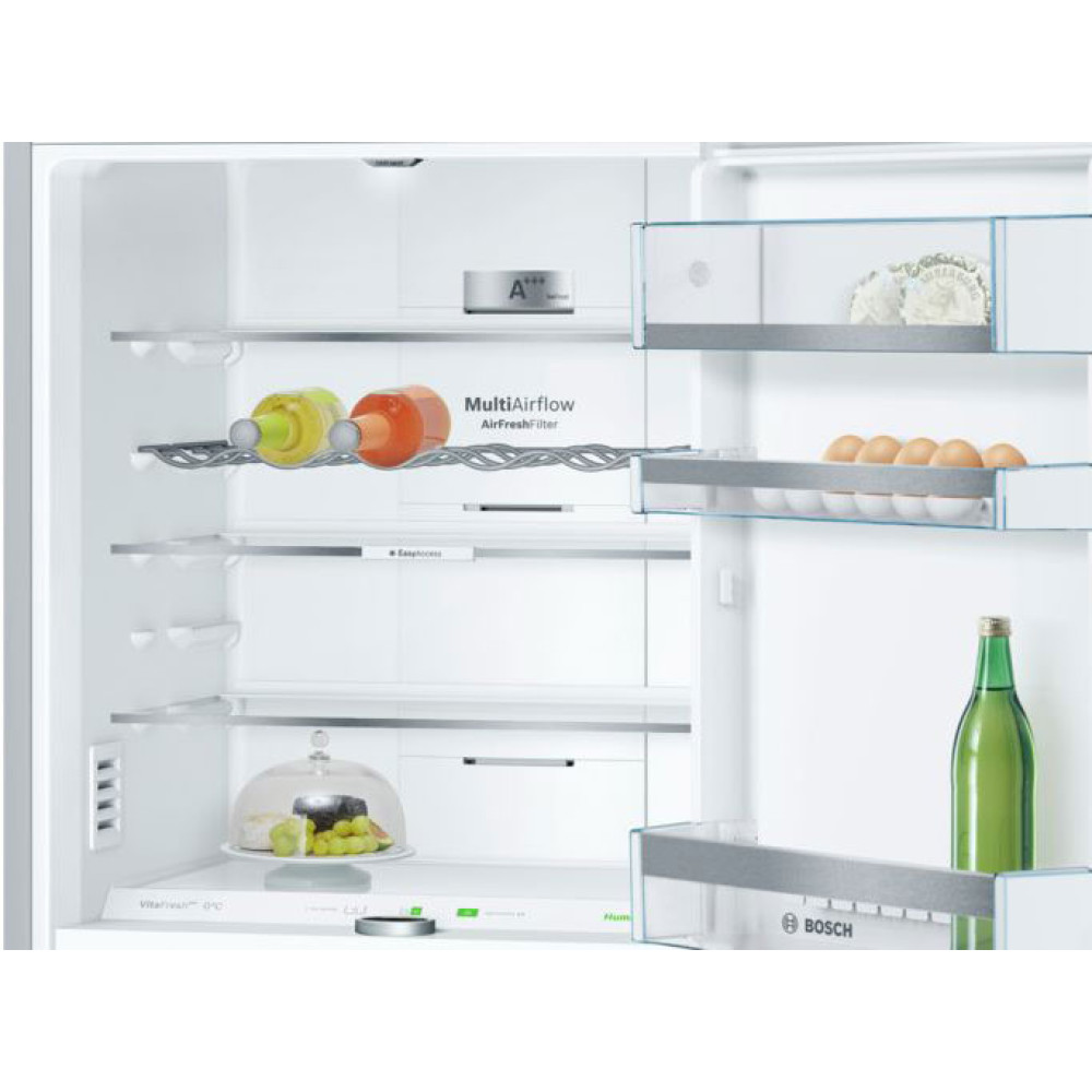 Холодильник Бош VitaFresh Serie 8 з нижньою морозильною камерою, шириною 70 сантиметрів. Колір дверцят: Hержавіюча сталь легкого очищення з покриттям Antifingerprint. Технологія розморожування NoFrost. Зона свіжості з температурою близькою до 0° C. Рідкокристалічний дисплей на зовнішній стороні дверцят для вибору температури в обох камерах, спеціальних режимів роботи приладу та функцій.