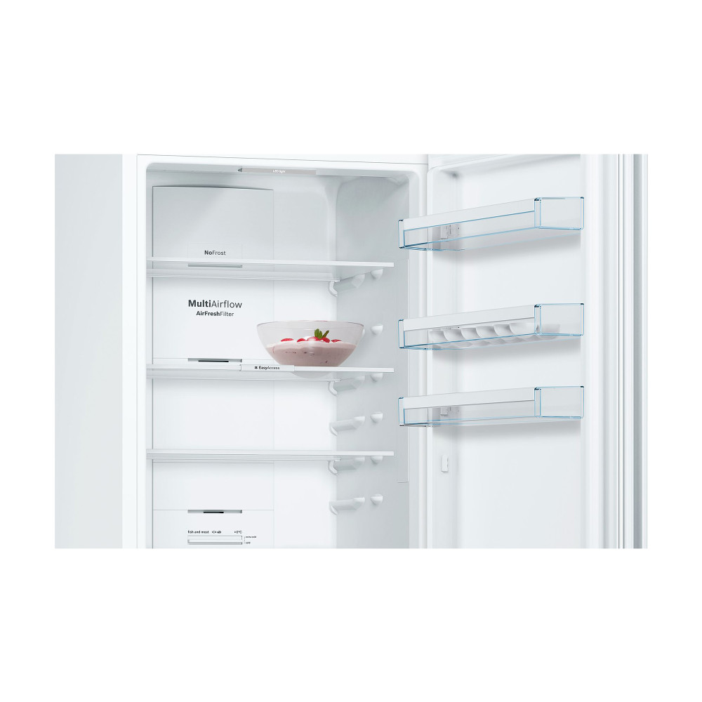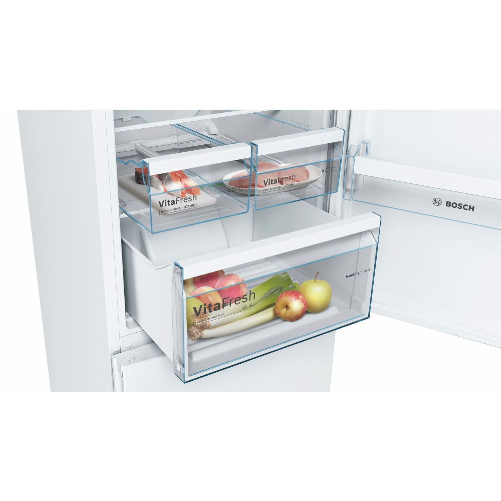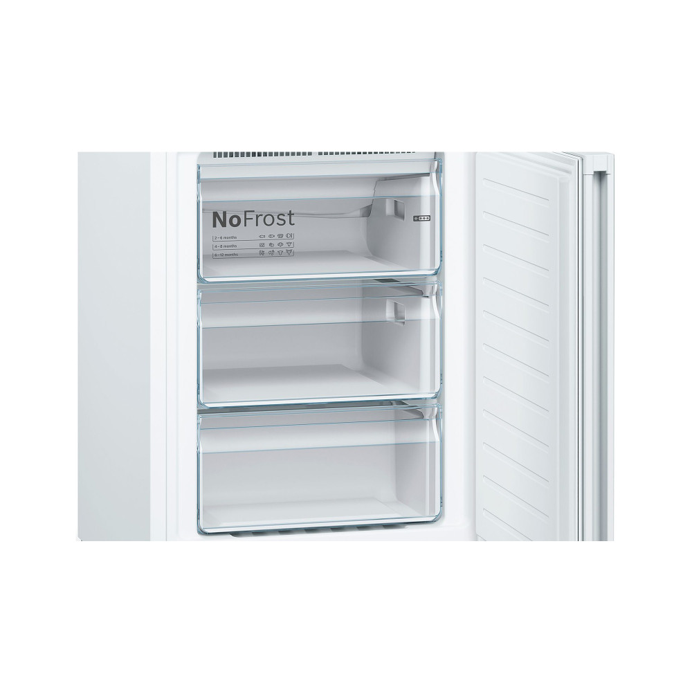Холодильник Бош Serie 4 з нижньою морозильною камерою у білому кольорі. Технологія розморожування NoFrost. Роздільне електронне регулювання температури у холодильній та морозильній. VitaFresh: продукти залишаются свіжими завдяки ідеальним умовам зберігання.
