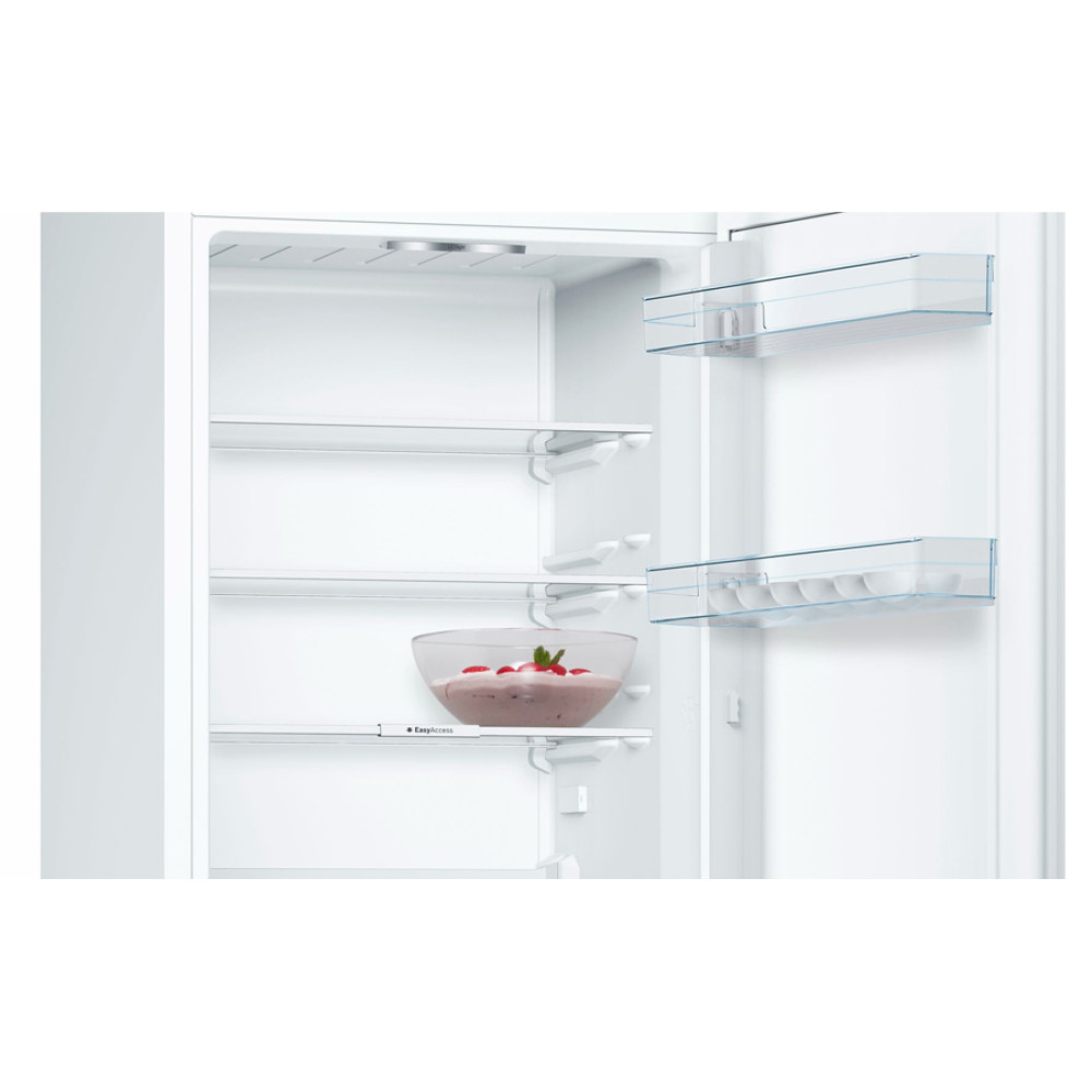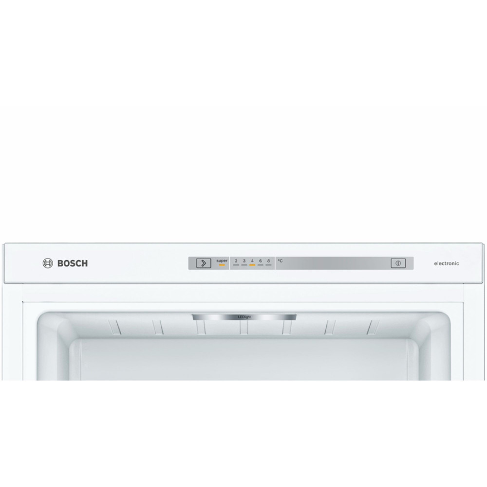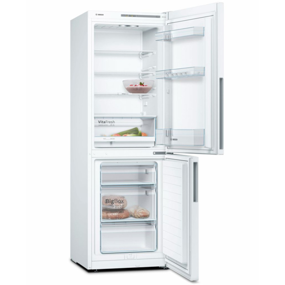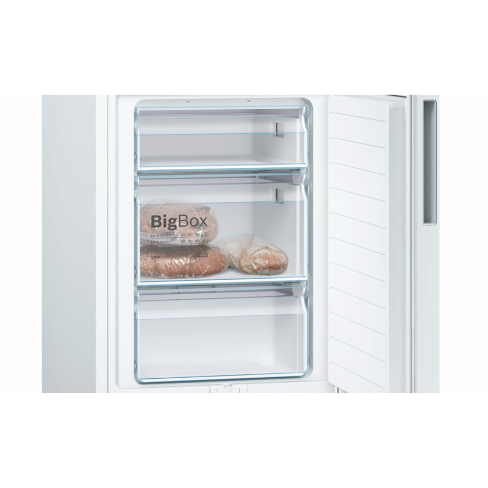 Холодильник Бош Serie 4 з нижньою морозильною камерою у білому кольорі. Зона свіжості VitaFresh Box і технологією LowFrost. Контейнер BigBox для продуктів великого розміру. Електронне регулювання температури зі світлодіодною індикацією. Автоматичне розморожування у холодильній камері.