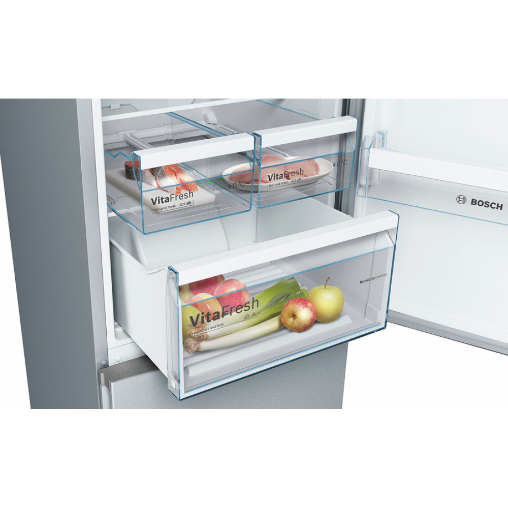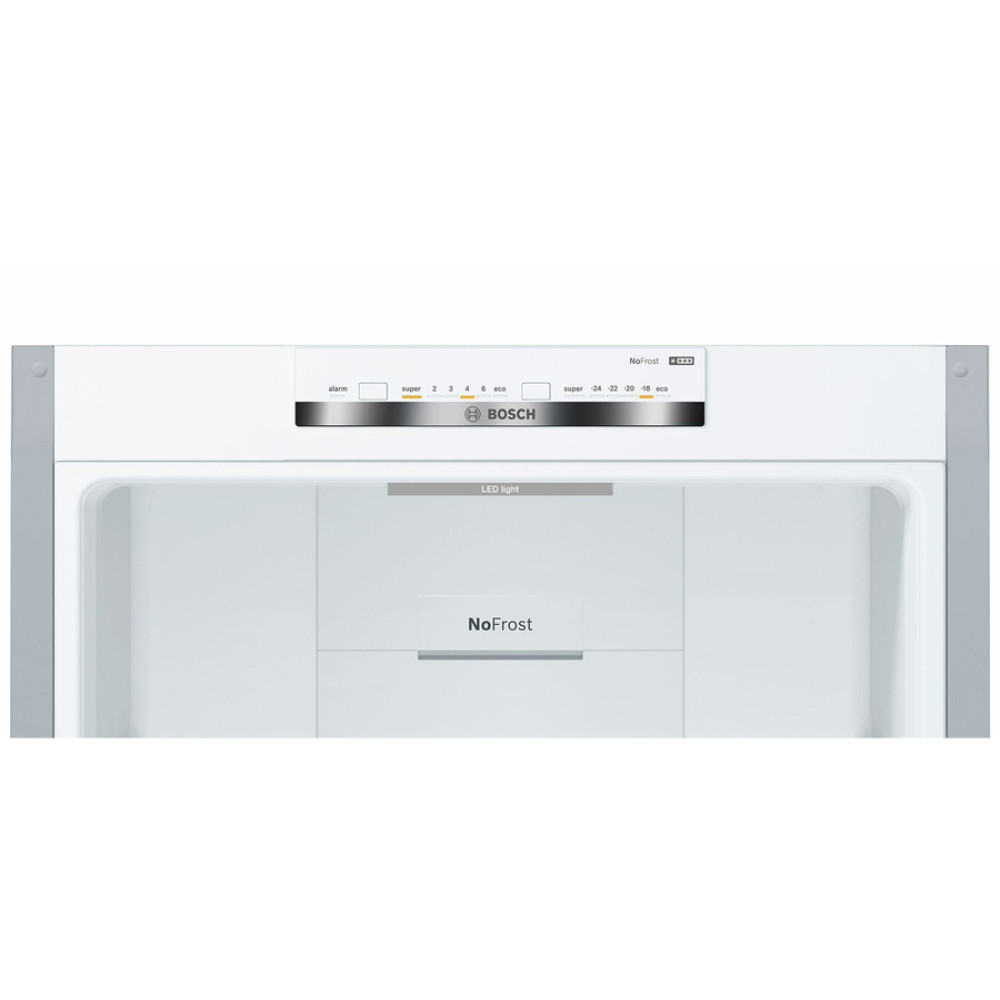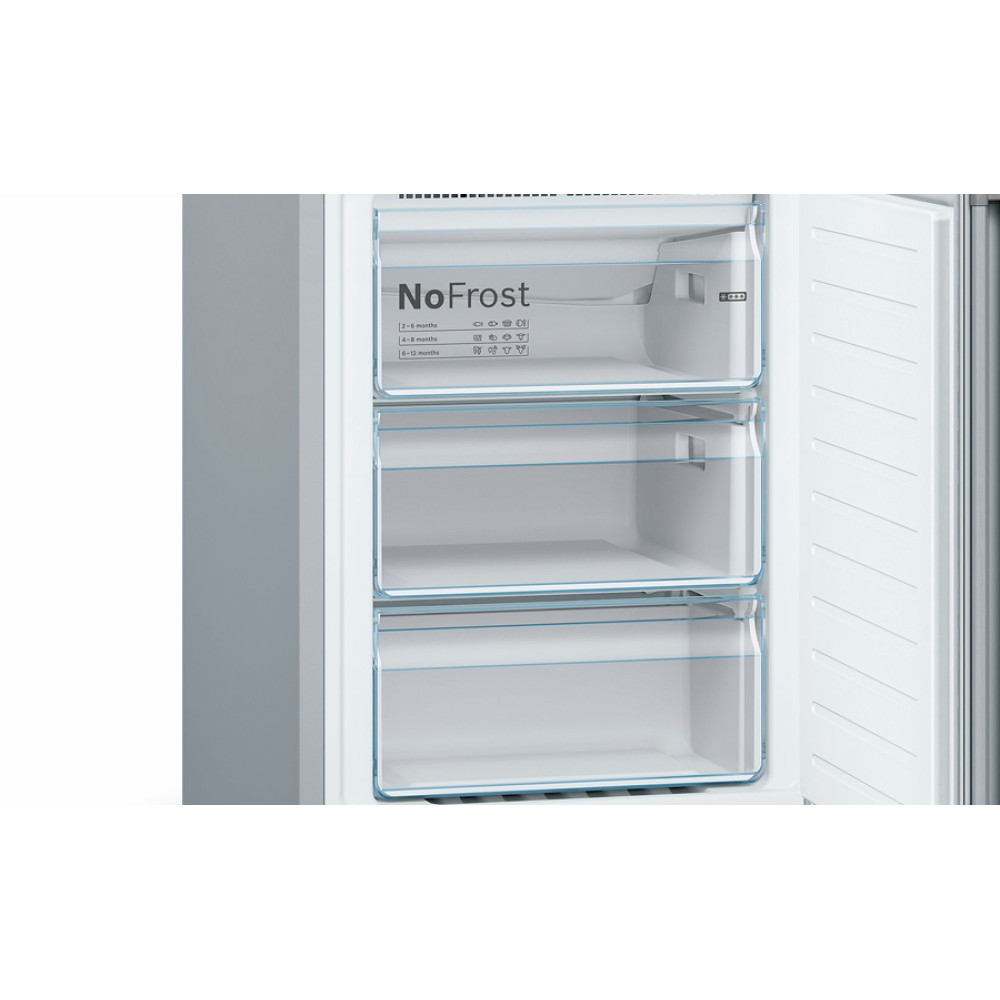 Холодильник Бош Serie 4 з нижньою морозильною камерою. Колір дверцят: імітація нержавіючої сталі Inox Look. Роздільне електронне регулювання температури у холодильній та морозильній камерах. Зона свіжості з температурою близькою до 0° C.