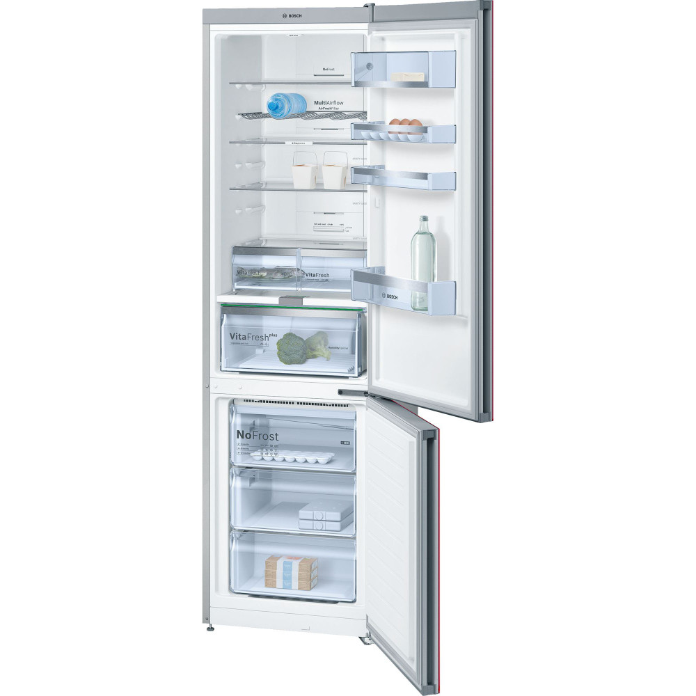 Холодильник Бош Serie 6 з нижньою морозильною камерою. Червоний колір дверцят. Корпус темно-сірий Metallic Сhrome. Технологія розморожування NoFrost. Зона свіжості HydroFresh Box. Рідкокристалічний дисплей на зовнішній стороні дверцят для вибору температури в обох камерах, спеціальних режимів роботи приладу та функцій.