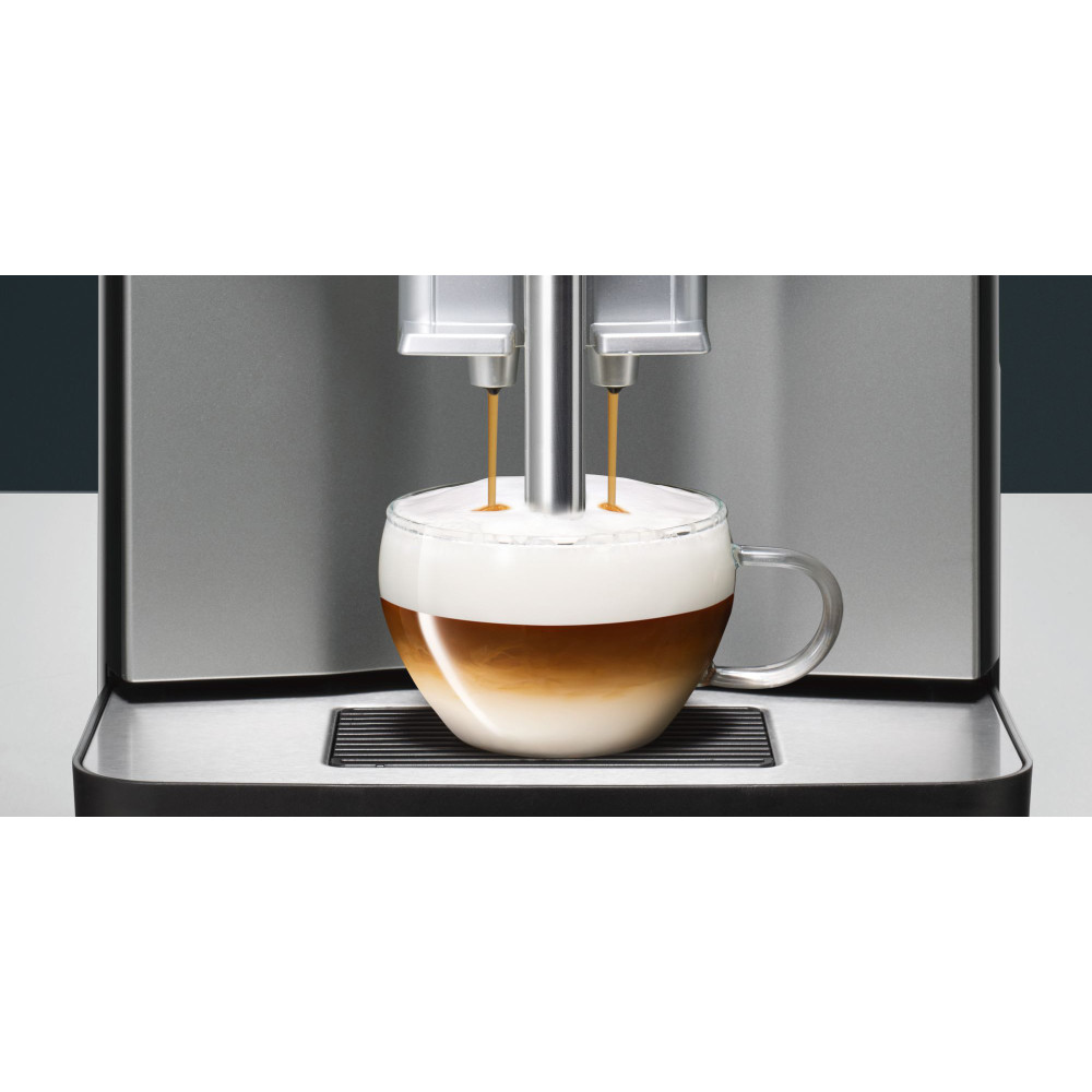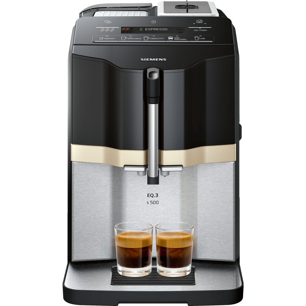 Повністю автоматична кавомашина Сіменс Серії EQ.3 s500 з регулюванням міцності улюбленого напою + режим aromaIntense. Функція підігріву чашок. Система управління coffeeDirect: сенсорні кнопки з підсвічуванням. Текстовий дисплей з можливістю вибору мови. Автоматичні програми чищення і видалення накипу