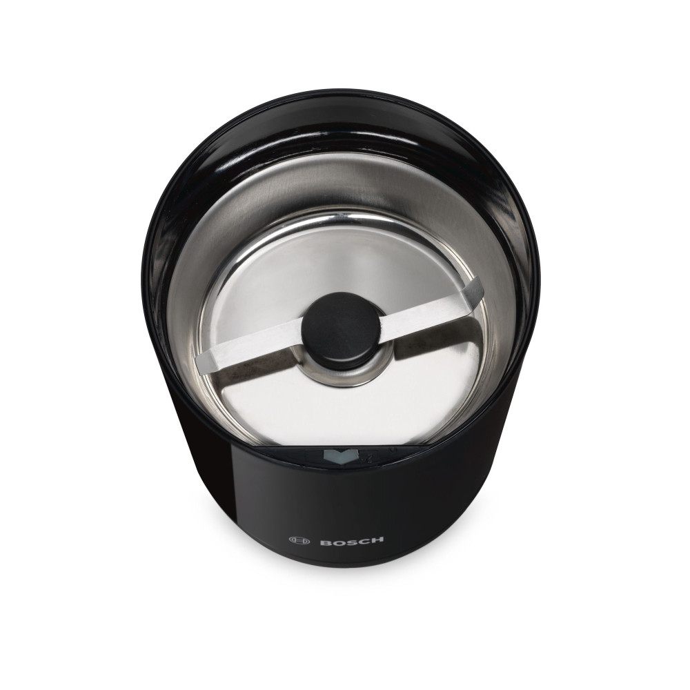 Кавомолка Бош чорного кольору. Місткість: 75 г кавових зерен. Кнопка для безпечного включення. Ніж з нержавіючої сталі для ще більш якісного помелу.