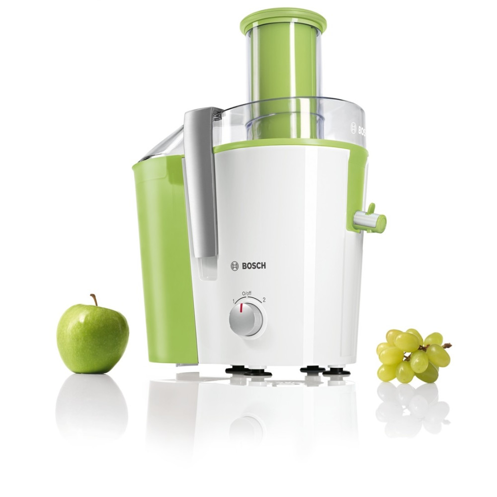 Соковижималка Бош: 2 швидкісні режими для твердих і м’яких фруктів та овочів, сито з нержавіючої сталі. Високий рівень безпеки: двигун приладу вмикається лише за умови правильного монтажу деталей та при закритій кришці. Збільшений отвір для завантаження фруктів та овочів без попереднього нарізання