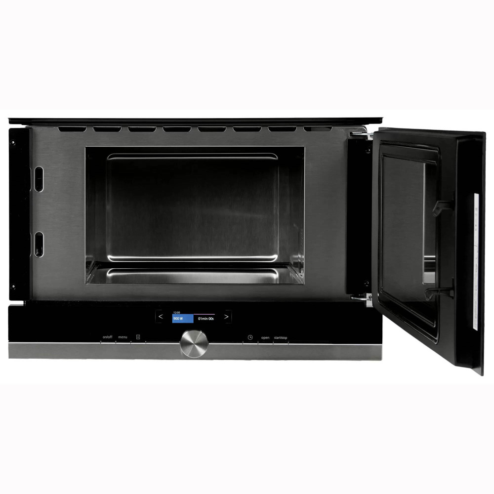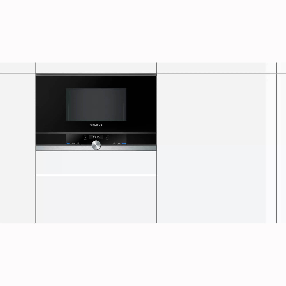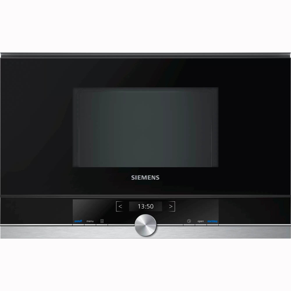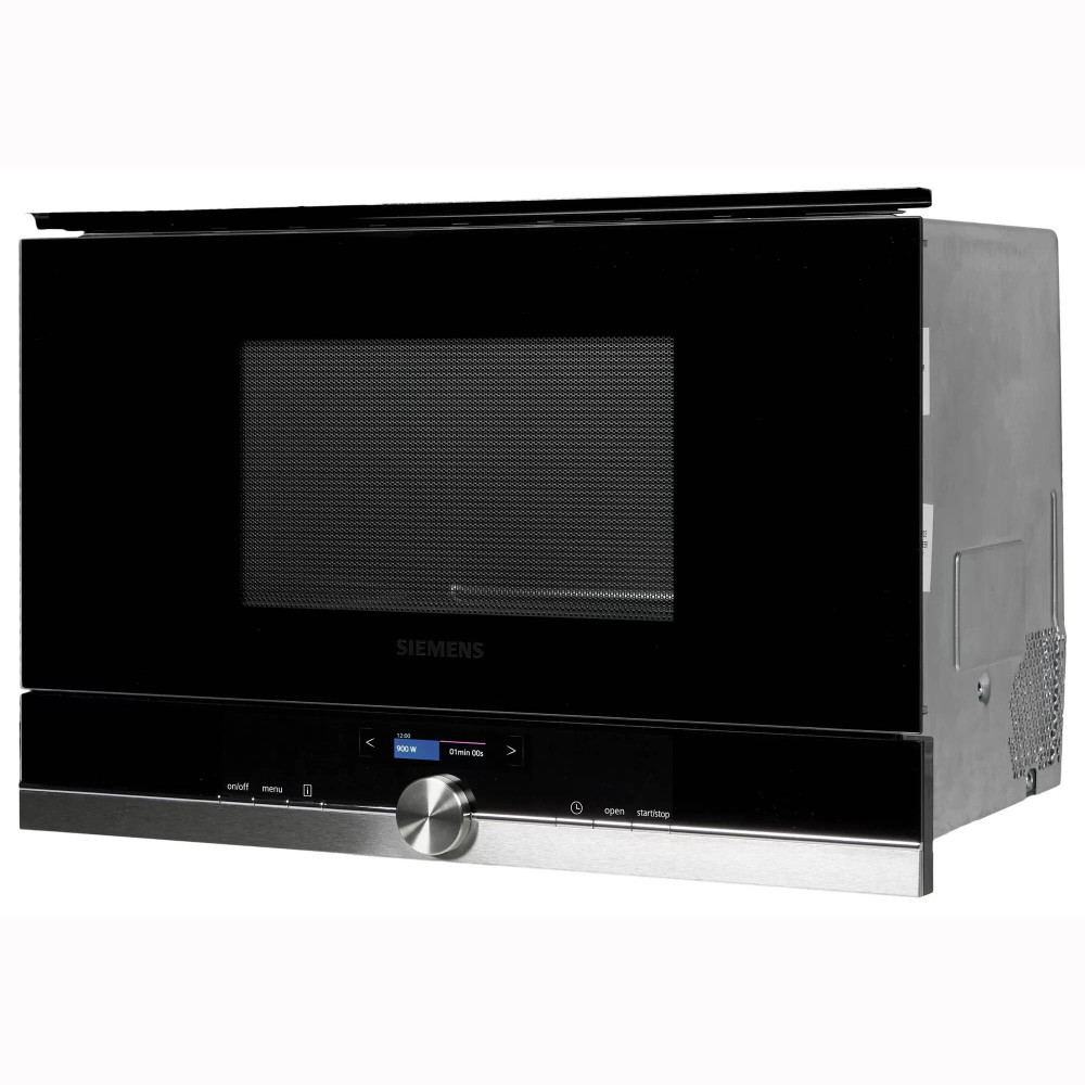 Мікрохвильова піч Сіменс iQ700 для вбудовування в кухонні меблі. Дизайн нержавіюча сталь з чорним склом. Кольоровий текстовий TFT дисплей. 7 автопрограм, 5 рівнів потужності. Внутрішня камера повністю з нержавіючої сталі.